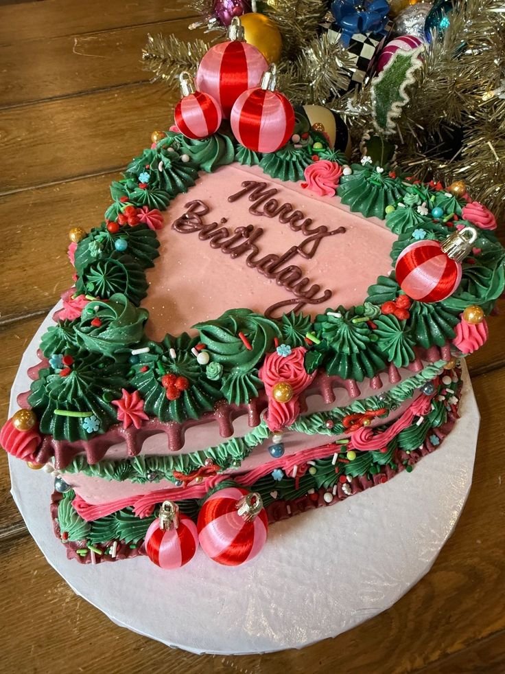Tiny metallic and striped baubles decorate the top, mimicking classic glass tree ornaments. The “Merry Birthday” message, written in chocolate, adds a sweet finishing touch to the dessert.