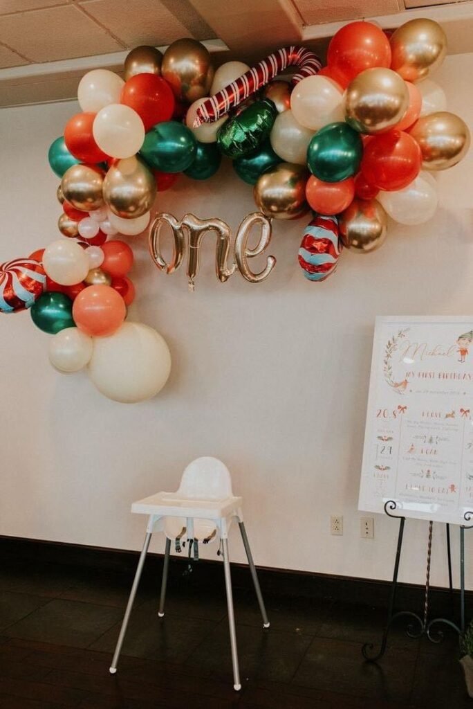 A large foil balloon spelling out “one” clearly announces the significant milestone. Candy cane and peppermint swirl accent balloons add a playful, sweet touch to the dynamic arrangement.