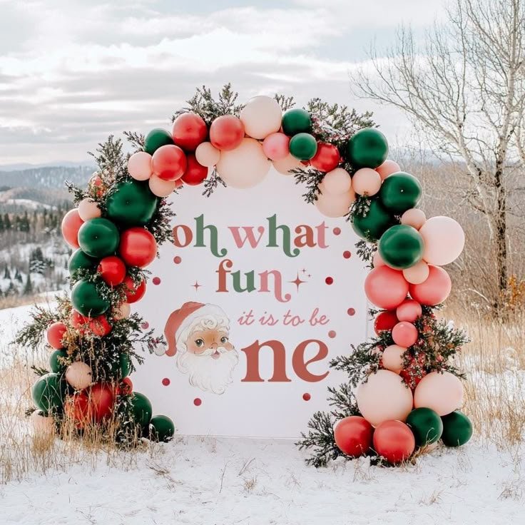 A gorgeous balloon arch frames a cute, custom sign reading, “Oh what fun it is to be one.” The deep forest green and rosy pink balloons offer a modern, refreshing twist on classic holiday colors.