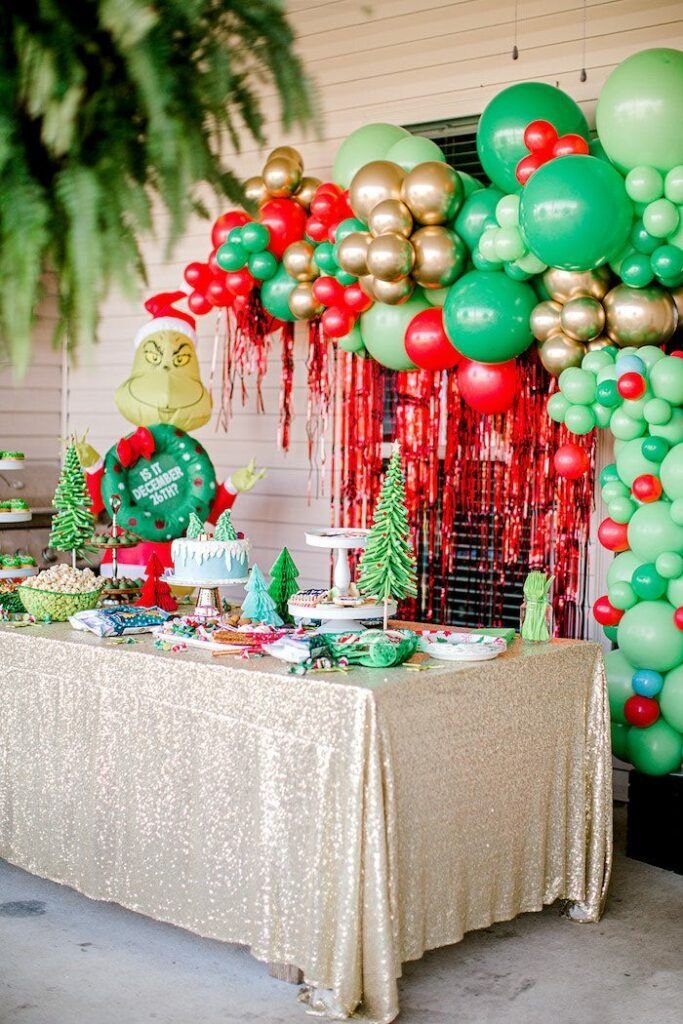 This vibrant party table captures the fun of a Grinch-inspired winter birthday celebration. A shimmery gold sequined tablecloth sets a glamorous and dazzling foundation for the treats.