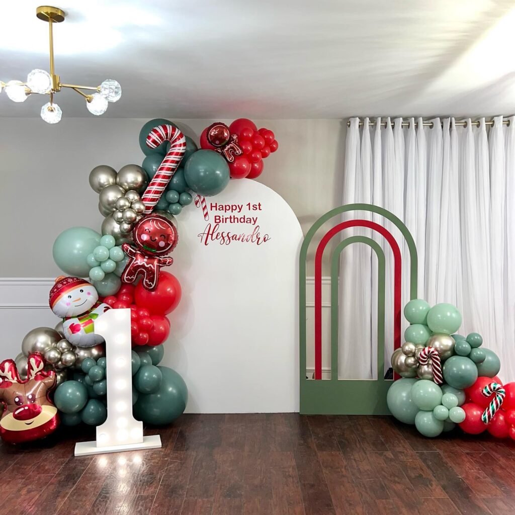 Fun foil balloons shaped like a gingerbread man, a smiling snowman, and a reindeer complete the look. The green and red archway adds a touch of architectural elegance to the celebration.