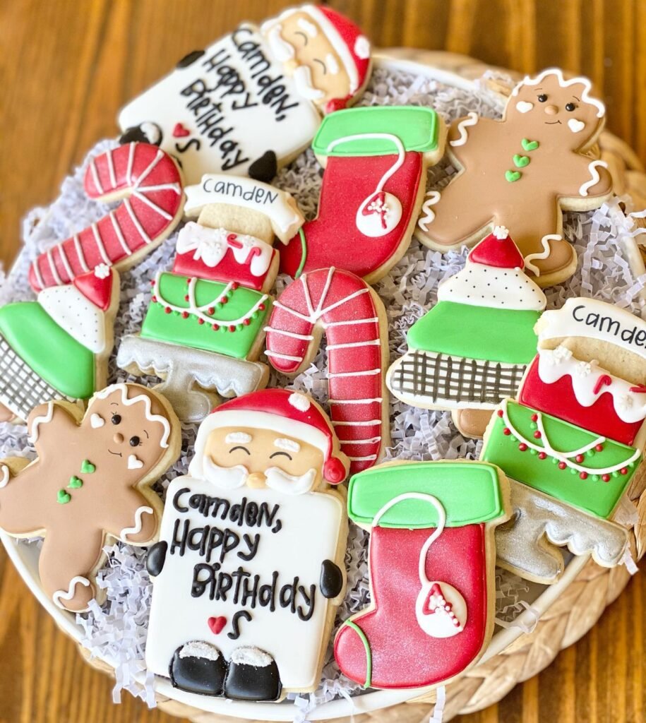 Sweet gingerbread men, classic candy canes, and cute stockings fill the basket. Santa Claus cookies also convey a special “Happy Birthday” message, personalized for the celebrant.