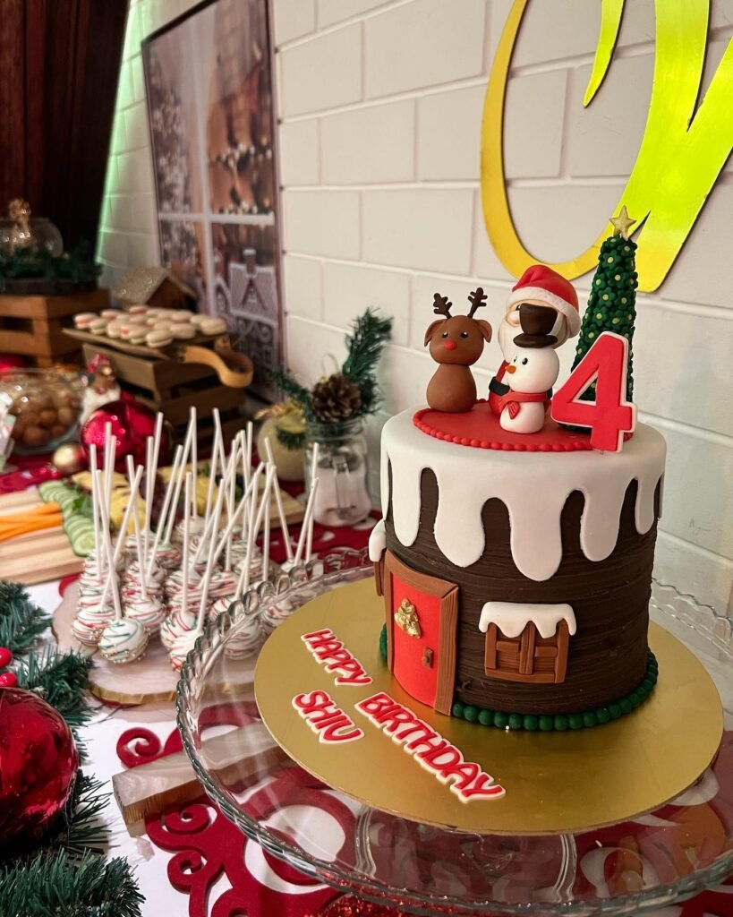 Sweet toppers feature a smiling snowman in a Santa hat, a reindeer, and a miniature tree. The large red number “4” boldly announces the birthday age, making it highly personalized.