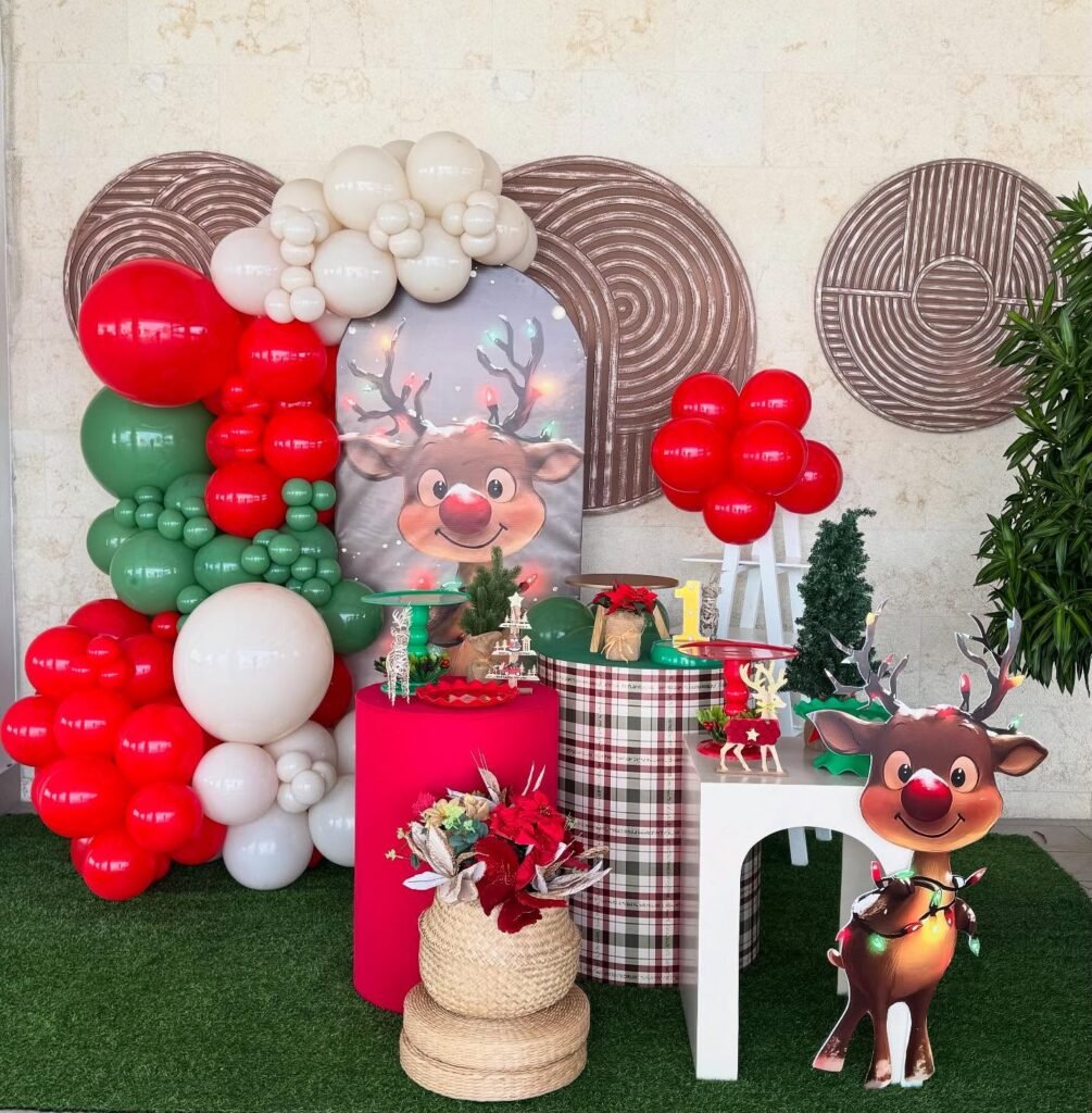 This charming setup uses warm, rustic textures combined with classic holiday colors for a fantastic celebration. A custom backdrop features a sweet reindeer image surrounded by soft lighting effects.