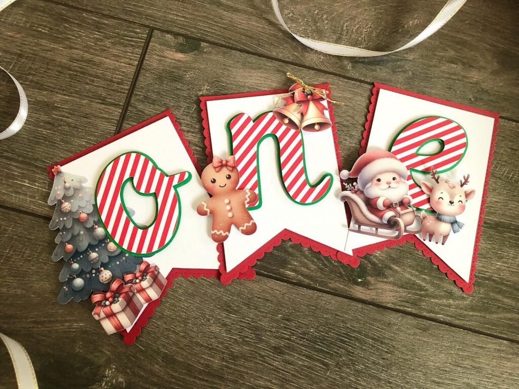 A playful Santa Claus sitting in a sleigh with his reindeer anchors the final panel. This cheerful garland provides the perfect backdrop for memorable first birthday photographs.