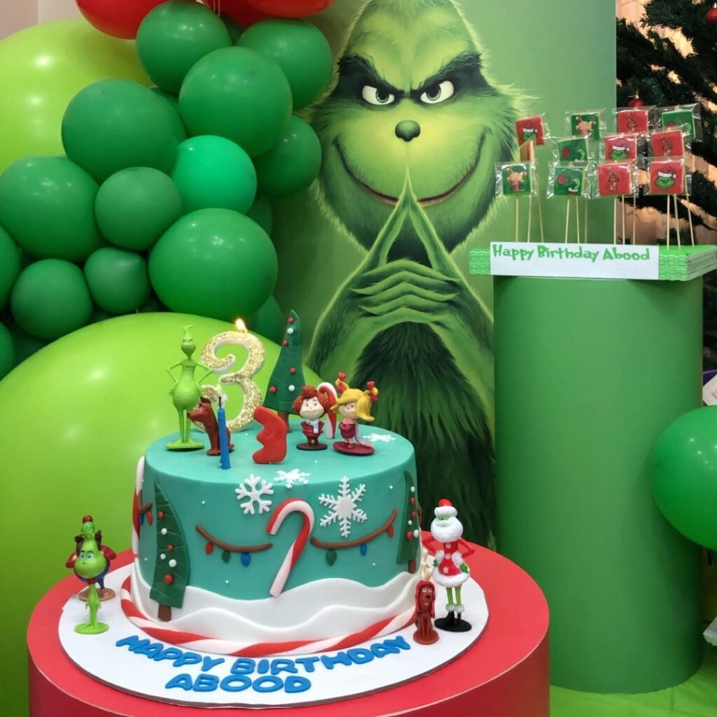 Figurines of the Grinch, Cindy Lou Who, and other characters beautifully adorn the cake’s snowy top. A huge Grinch backdrop and balloon arch in various shades of green provide a vibrant setting.
