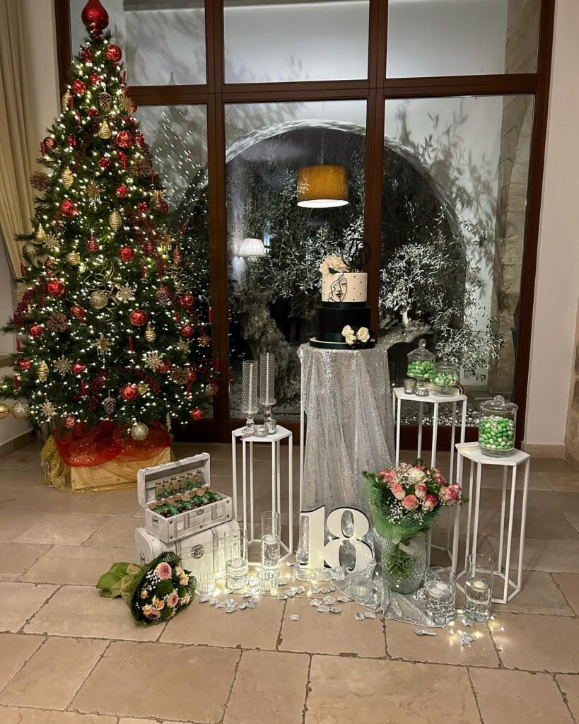 This striking display celebrates an 18th birthday with a sophisticated, grown-up holiday theme. The tall, brightly lit Christmas tree provides a wonderfully dramatic focal point for the celebration.