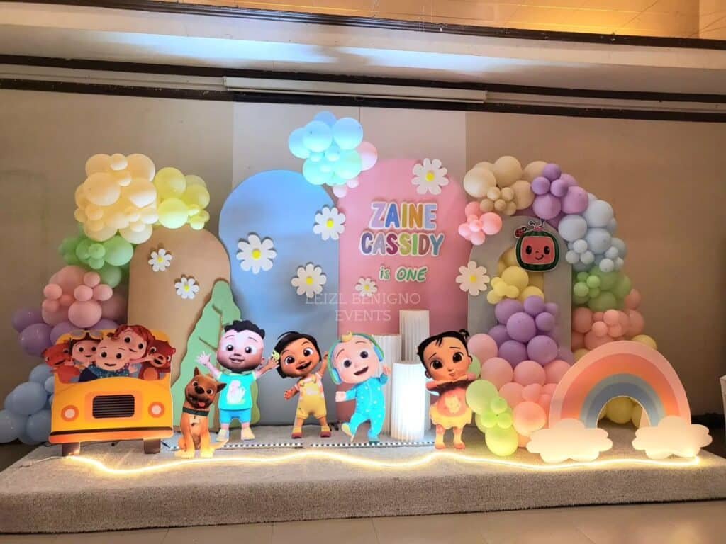 This pastel-themed Cocomelon party ideas stage creates a dreamy atmosphere. Soft colored balloons and daisy cutouts frame the personalized backdrop. It celebrates Zaine Cassidy’s first birthday.