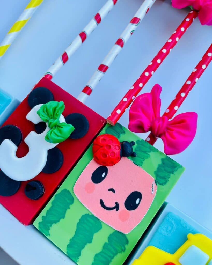 These delightful Cocomelon party ideas fudge pops are a sweet treat. The red pop is adorned with a number 3, while a green watermelon pop smiles sweetly. Each one is a little masterpiece.