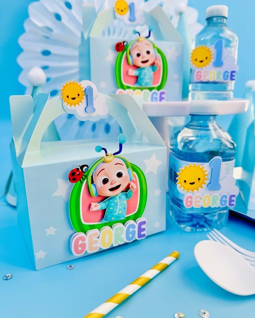 These adorable Cocomelon party ideas favor boxes are a delightful touch. Each light blue box features a cutout of J.J., the beloved character, surrounded by stars. Personalized with the guest’s name, they add a special keepsake feel.