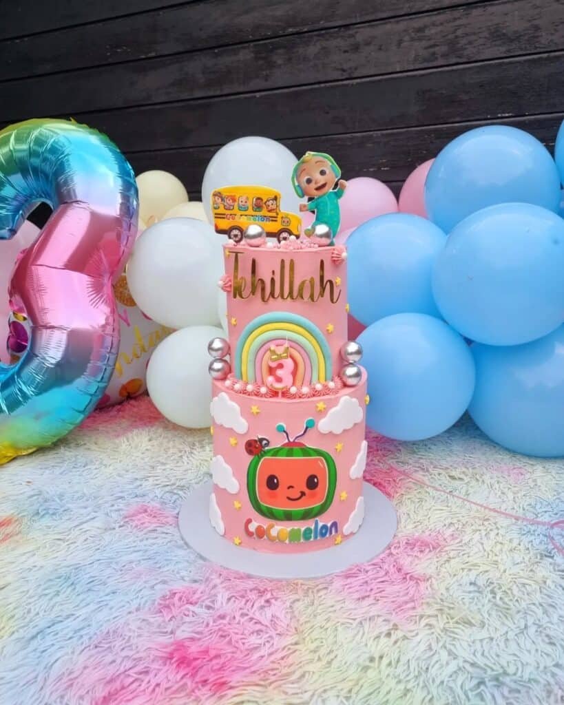 This charming two-tier Cocomelon cake stands out as a sweet centerpiece. Bright pink frosting creates a fun base. Beloved characters adorn each layer, bringing the theme to life.