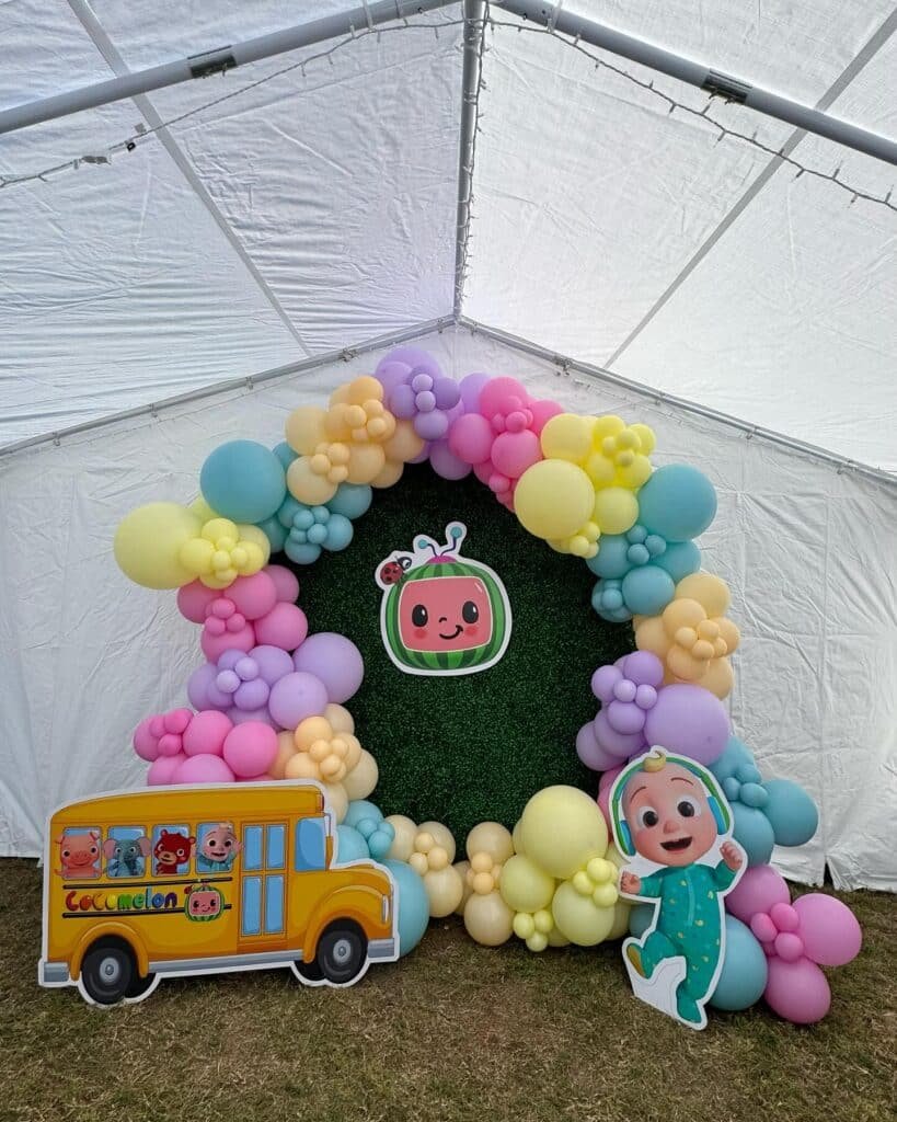 This charming pastel Cocomelon party ideas setup is perfect for a birthday photo. Soft-colored balloons form a graceful arch over a pink backdrop. It’s a sweet and elegant design for celebrating.