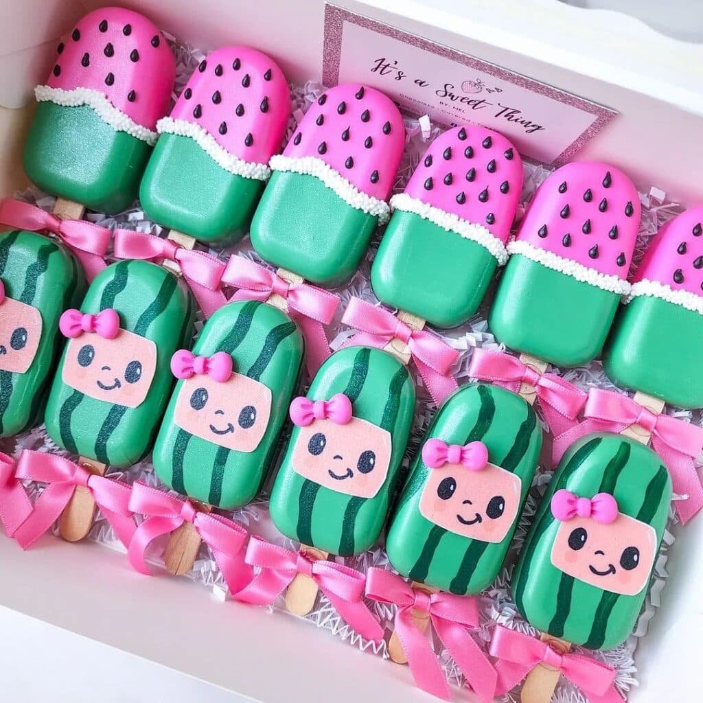 These adorable cocomelon party ideas dessert pops are a true showstopper. The top row features pops shaped like watermelon slices, complete with black seeds and a white candy rind. They are bright and fun.