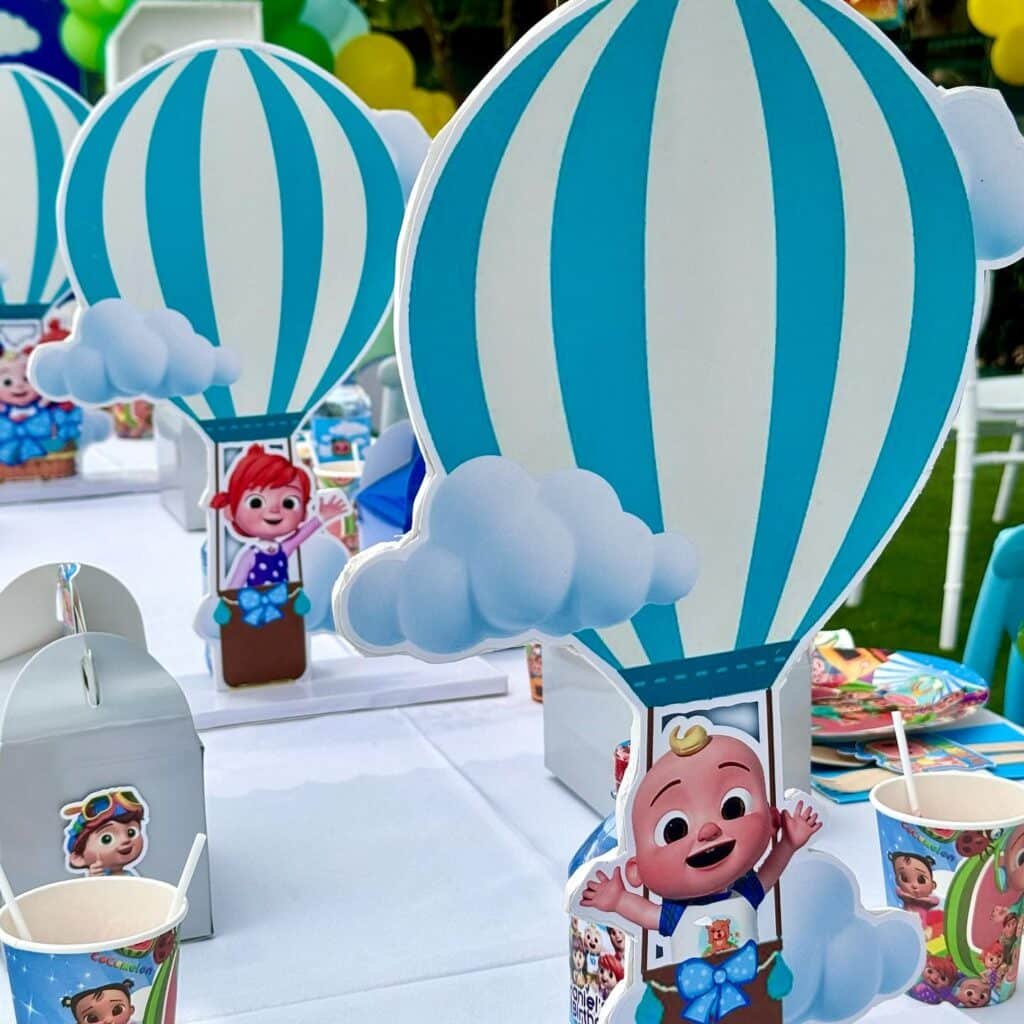 These charming hot air balloon centerpieces are a standout among cocomelon party ideas. Each one features a happy character cutout peeking from the basket. They are a playful and creative addition to any party table.