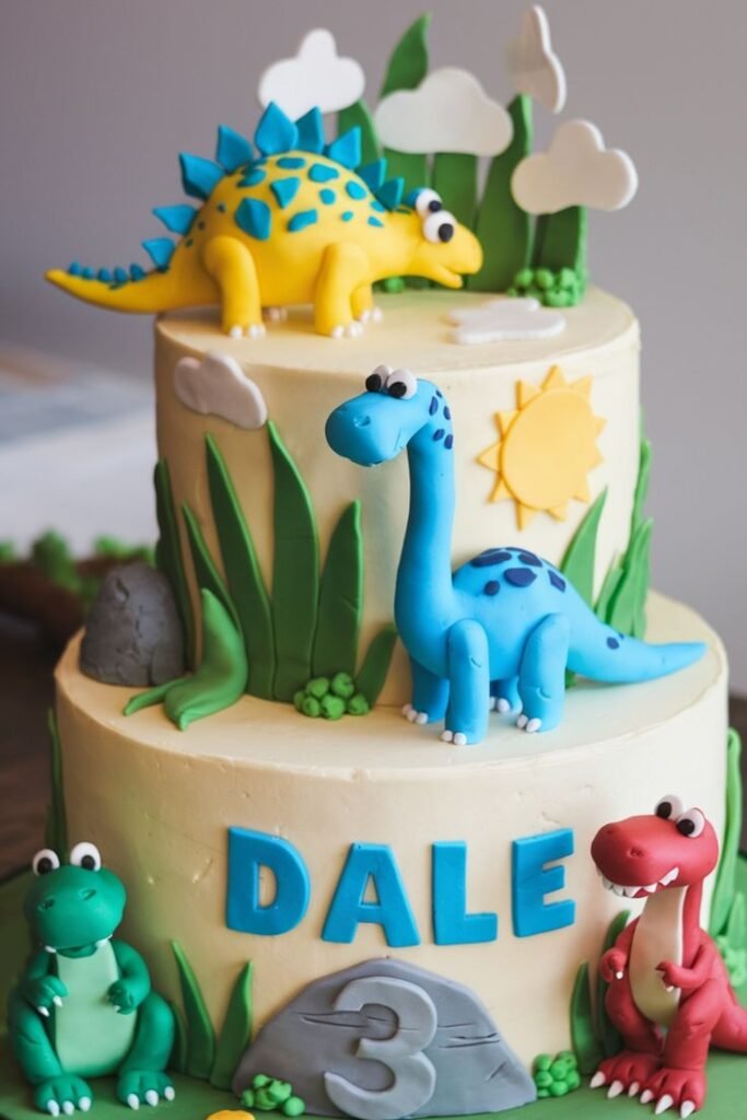 This lively two-tiered dinosaur birthday cake is a vibrant scene of prehistoric fun, celebrating Dale’s third birthday with engaging characters. A cheerful yellow stegosaurus with blue spikes sits atop the upper tier, surrounded by whimsical clouds and green foliage. This sets a playful tone for the entire design.