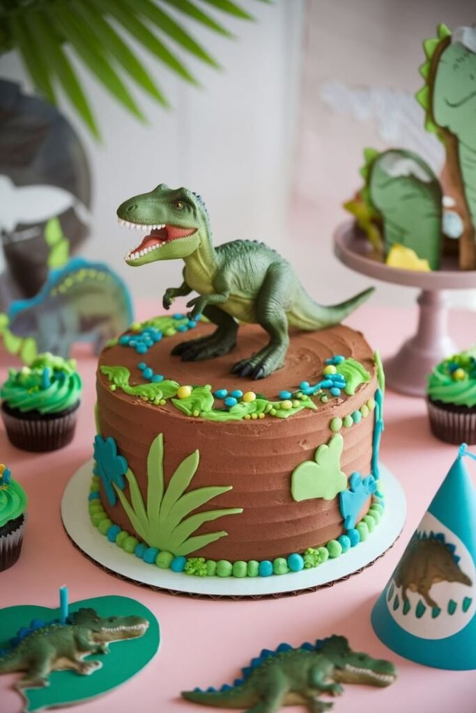 This show-stopping creation proves that a dinosaur birthday cake can be both wildly fun and elegantly designed. It’s a choice for an unforgettable celebration, promising an exciting prehistoric adventure right on the dessert table.