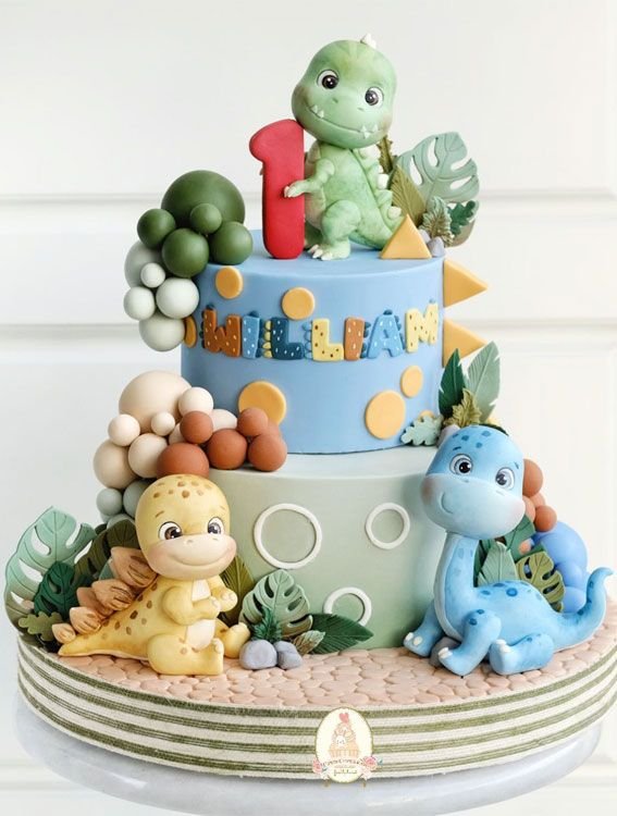 This dinosaur birthday cake is full of charming details and soft, inviting colors. It’s a wonderful choice for a baby’s first birthday, offering a delightful and memorable way to celebrate a precious milestone with a fun dinosaur theme.