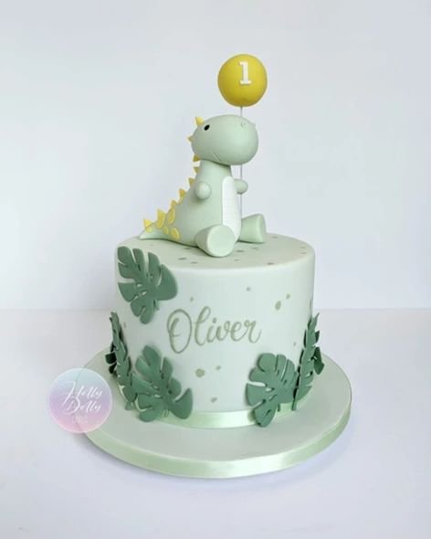 This adorable dinosaur birthday cake is a charming choice for Oliver’s first birthday celebration. A sweet, pastel green dinosaur sits proudly on top, holding a yellow balloon with the number “1,” signifying this special milestone. The cake’s light green base is subtly speckled, adding a playful texture.
