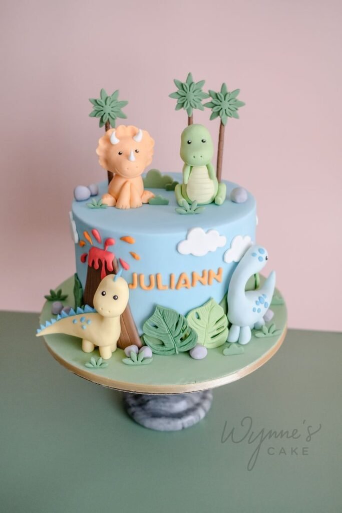 The cake’s side features an exciting erupting volcano, adding a splash of dramatic fun to the landscape. More friendly dinosaurs, including a pale yellow long-necked dinosaur and a light blue spotted one, explore the green terrain at the base, surrounded by edible leaves and tiny rocks. Juliann’s name is playfully spelled out in orange letters.