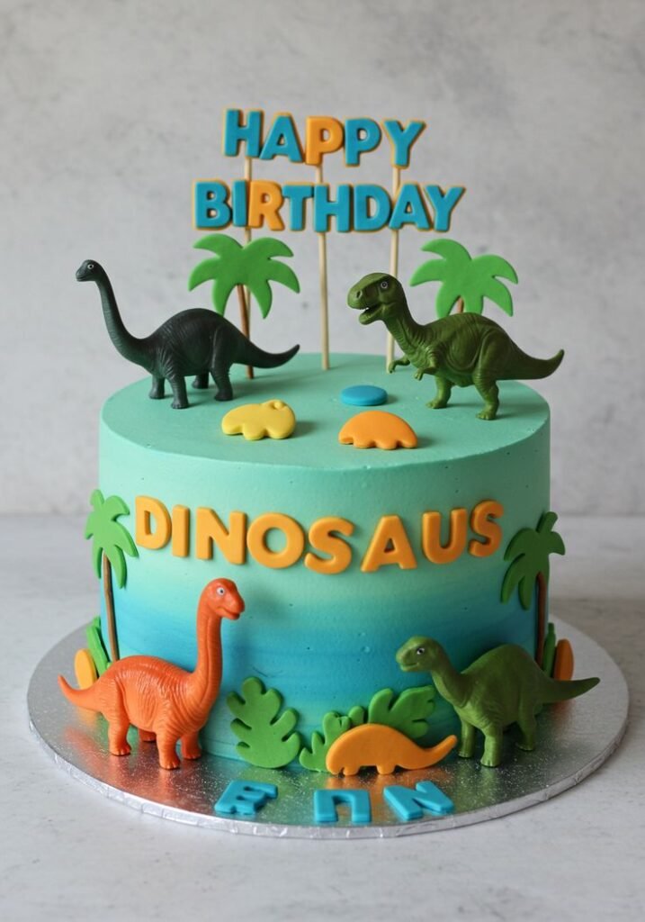 This vibrant dinosaur birthday cake brings a tropical prehistoric oasis to life with its cheerful design. A “Happy Birthday” topper in bold blue and orange letters crowns the cake, surrounded by an assortment of realistic dinosaur figures and charming palm trees. This sets a festive and adventurous tone for the celebration.