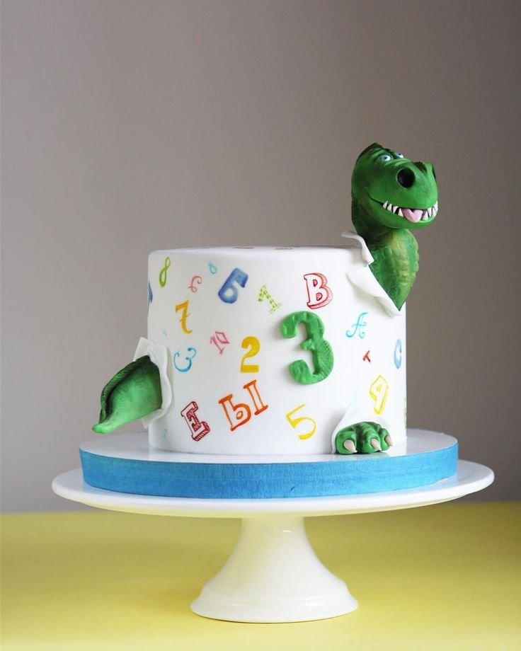 This incredibly creative dinosaur birthday cake features a mischievous green T-Rex playfully breaking out from a cake adorned with colorful numbers and letters. The “ripped” fondant effect where the dinosaur emerges is wonderfully executed, adding a dynamic and exciting element to the design. This cake is truly a surprise reveal!