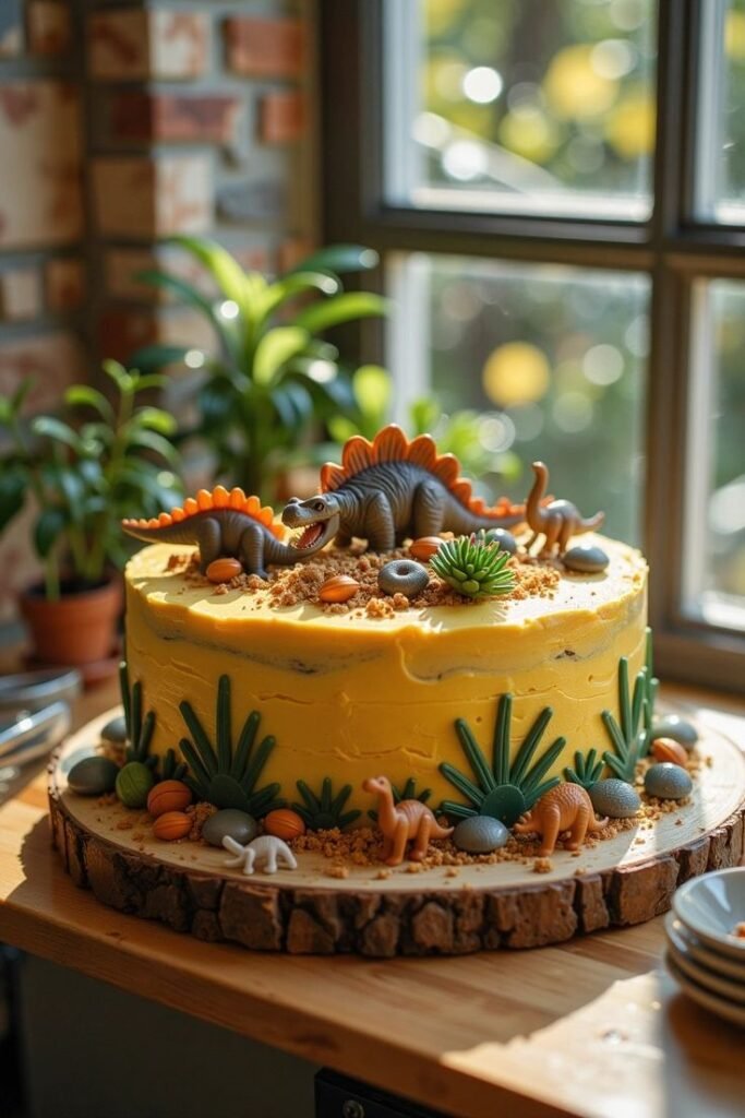The bright yellow frosting perfectly evokes a sandy terrain, while green edible plants sprout from the base, adding life to the ancient setting. The cake rests on a rustic wood slice, enhancing the natural, earthy feel of the design. This dinosaur birthday cake truly brings a wild adventure to the party table.
