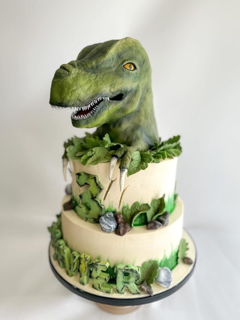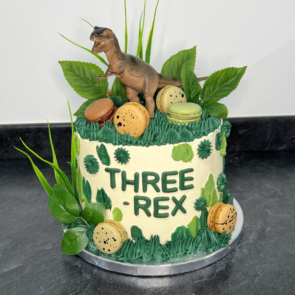 This fantastic dinosaur birthday cake brings the prehistoric world to life with a playful “Three-Rex” theme, celebrating a special third birthday. A majestic T-Rex figure stands tall amidst lush green foliage and charming edible leaves, creating a vibrant jungle scene. The buttercream is expertly decorated with delightful speckles and grass-like textures, adding to the adventurous atmosphere.