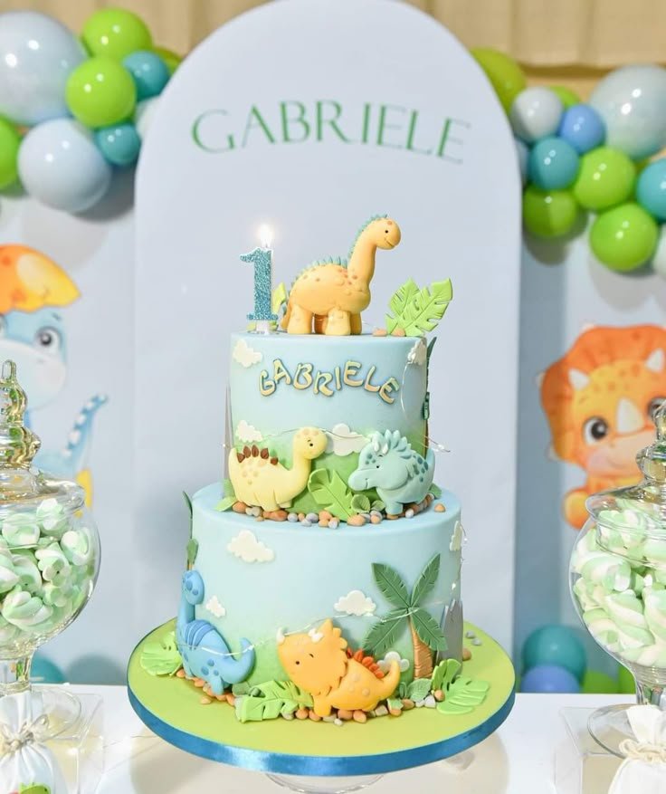 This charming two-tiered dinosaur birthday cake is a delightful center for Gabriele’s first birthday celebration. Soft blue frosting creates a serene sky backdrop, while friendly, chubby dinosaurs in various shades of yellow, green, and blue adorn both tiers. A tiny “1” candle sparkles atop, next to an adorable long-necked dinosaur.