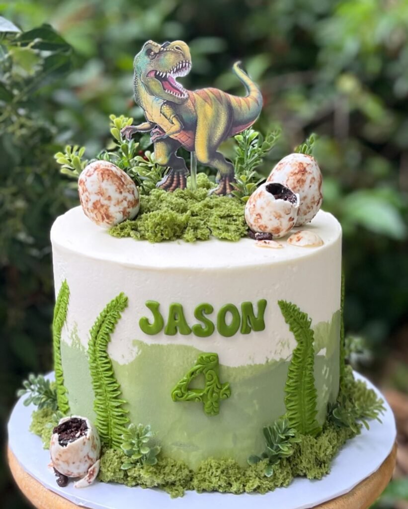 This exciting dinosaur birthday cake transports you directly to a prehistoric landscape, celebrating Jason’s fourth birthday with remarkable flair. A vibrant T-Rex cutout stands proudly amidst textured green “moss” and delicate foliage on top, creating an adventurous scene. Scattered around are realistic-looking dinosaur eggs, some dramatically cracked open to reveal their secrets, adding an element of surprise.