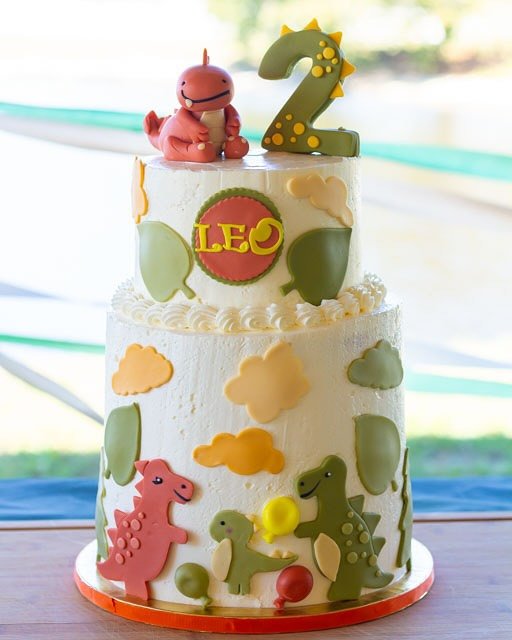 This charming two-tiered dinosaur birthday cake is bursting with playful character, celebrating a special second birthday for Leo. Adorable, friendly dinosaurs in various shades of green and pink adorn both tiers, alongside whimsical clouds and leaves. A cute little red dinosaur sits happily on top, next to a festive number “2” decorated with dinosaur-like spikes and spots.
