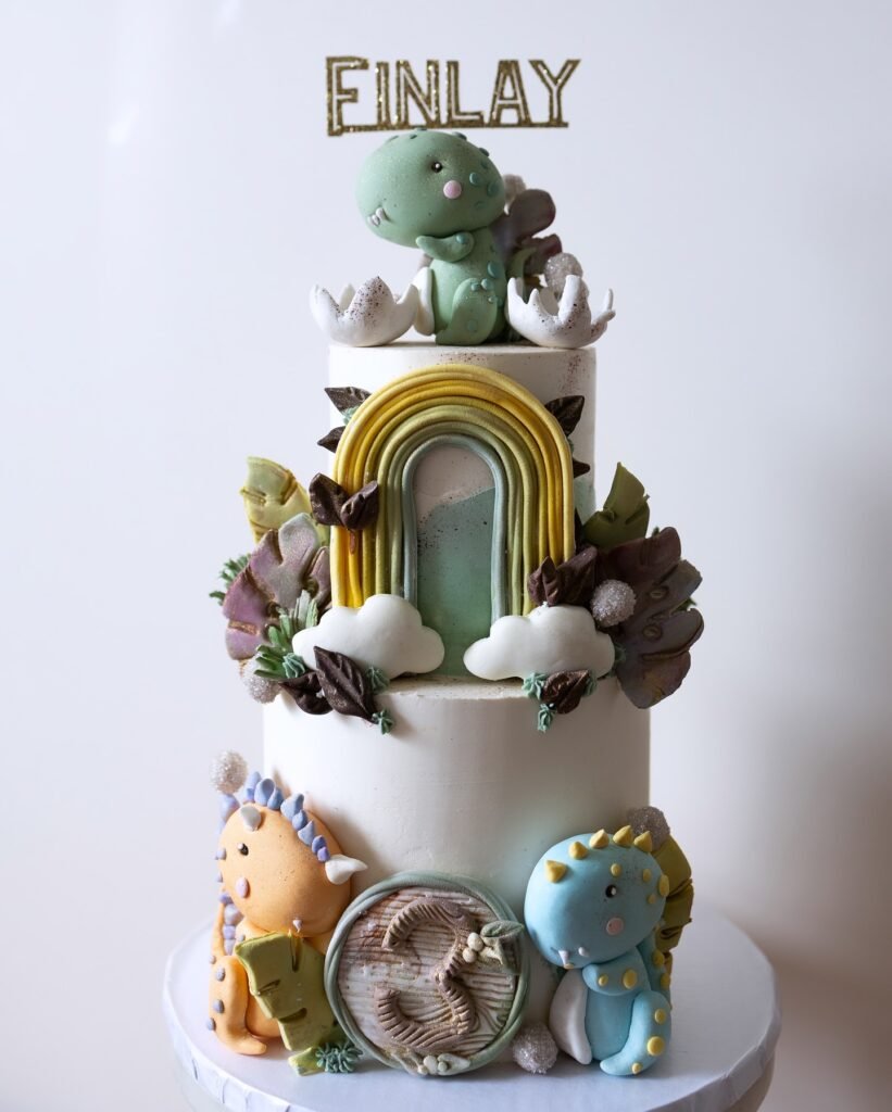 This enchanting three-tiered dinosaur birthday cake is a wonderland of prehistoric charm, celebrating Finlay with delightful artistry. Atop the cake, a sweet green baby dinosaur is playfully hatching from its egg, surrounded by delicate foliage. The name “FINLAY” gleams in gold lettering above, adding a personalized touch.