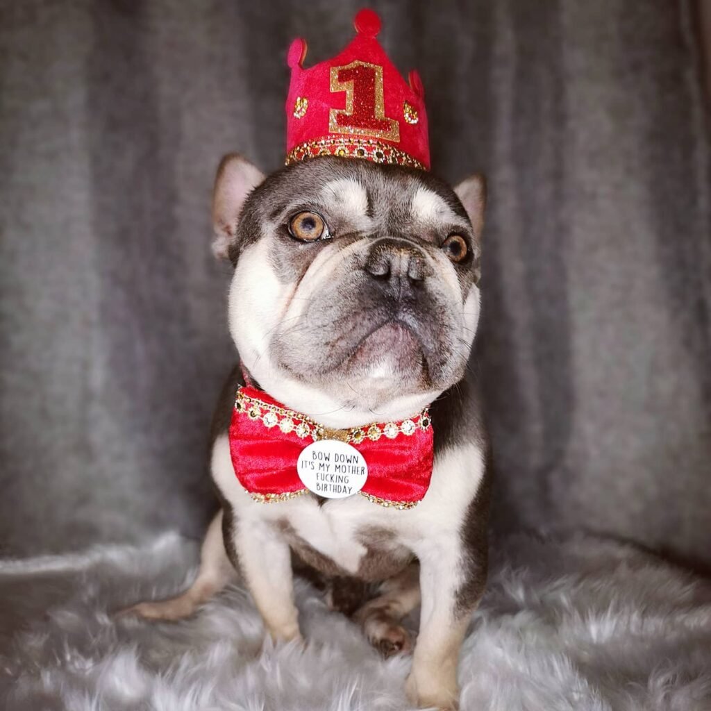 This precious French Bulldog is sporting a magnificent red birthday crown that makes them look absolutely regal. The matching bow tie adds such a dapper touch to the whole outfit.