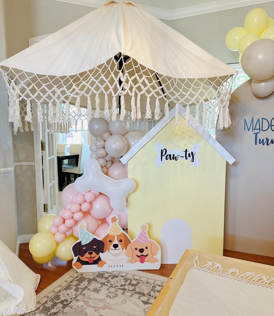 The macrame canopy creates such a whimsical atmosphere, while the balloon arrangements in soft pastels keep things elegant yet playful. The “Paw-ty” sign is absolutely adorable and really sets the theme.
