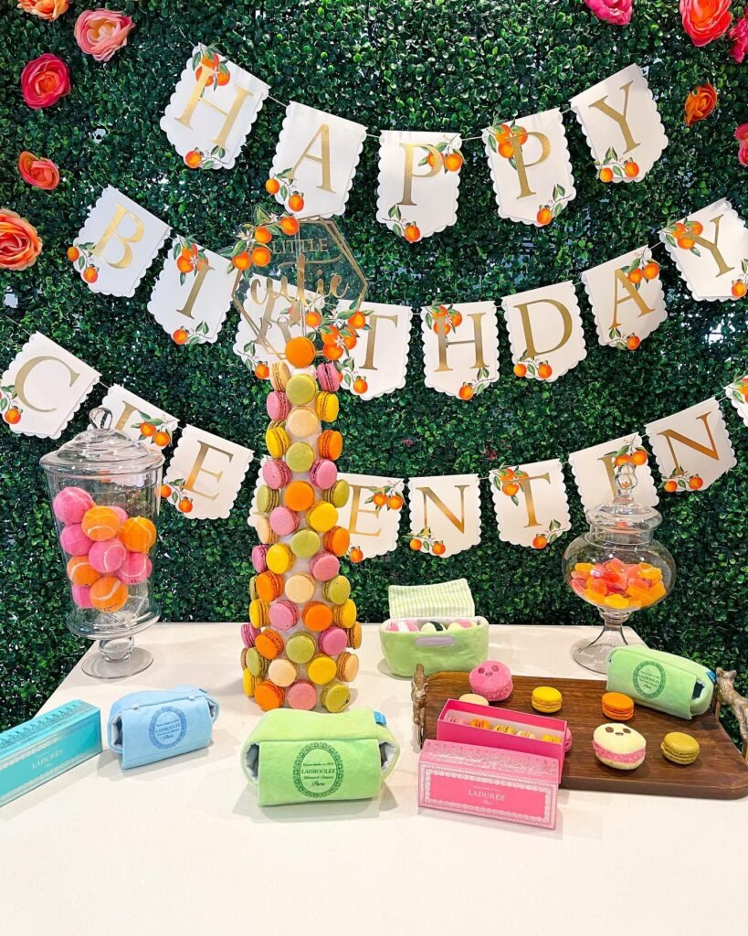 The “HAPPY BIRTHDAY” banner decorated with little oranges brings such a fresh, summery vibe to the party. The macaron tower adds an elegant touch – though these treats are for the humans!