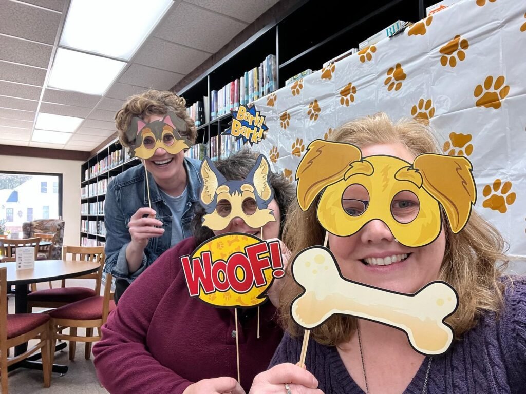 These colorful dog-themed masks and props will have everyone laughing and posing. The library setting shows how you can transform any space into a party zone with the right decorations.