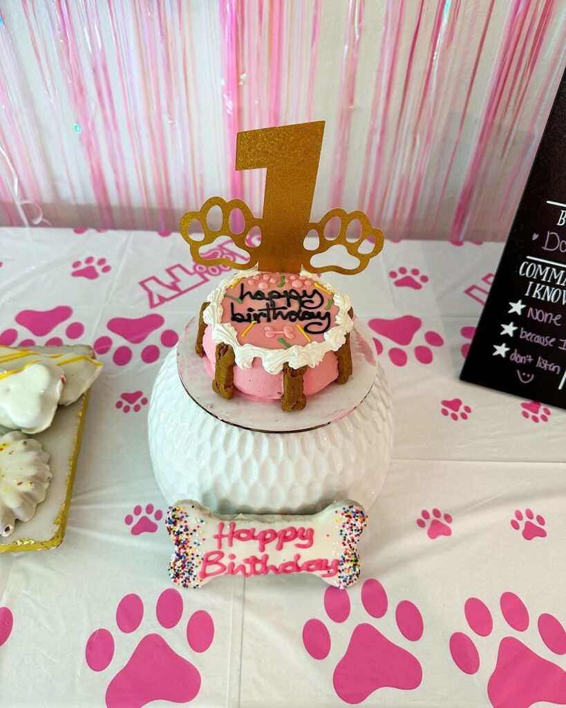 This pink paradise setup features a beautiful cake stand, paw print decorations, and that adorable number “1” topper with paw designs. The pink and white color scheme creates such a sweet atmosphere.