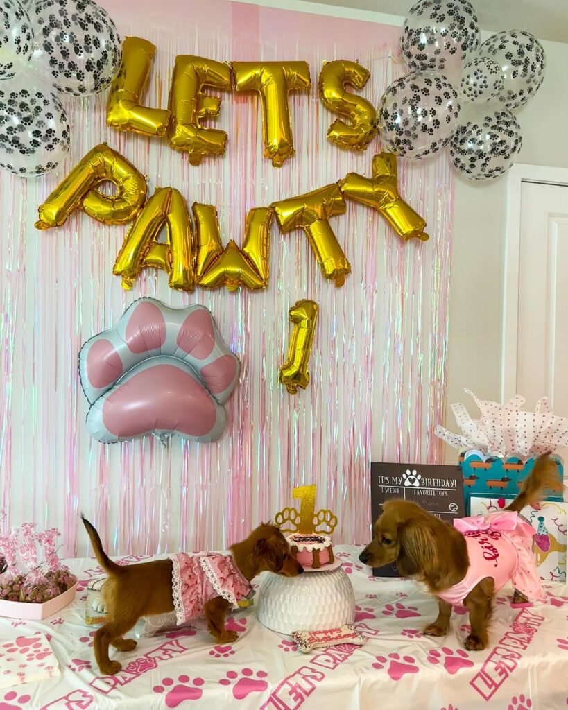The gold “LET’S PAWTY” letters paired with paw-print balloons create an energetic atmosphere that screams celebration. Having multiple dogs join the festivities makes it even more special – they can socialize while humans snap adorable photos.