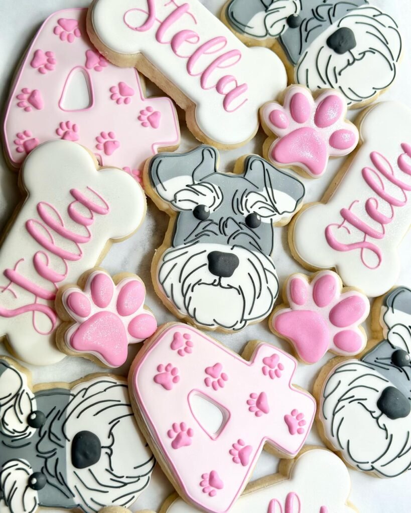 The beautiful pink and white icing creates such a sweet look, and I love how they’ve included both schnauzer dog faces and paw prints. You can personalize them with your pup’s name or age – like “Stella” shown here.