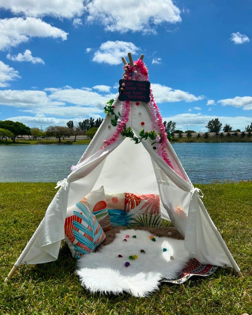 This lakeside teepee setup proves you don’t need an indoor venue to throw an amazing celebration. The white teepee decorated with flowers creates a cozy space for your dog to relax.