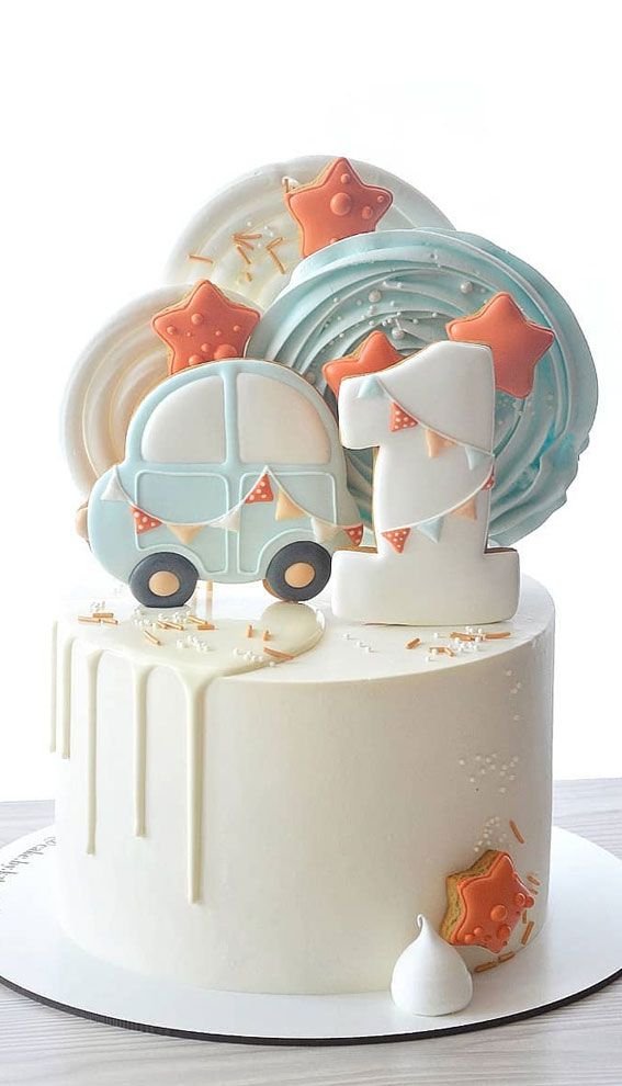 This sweet, car-themed cake is a playful choice for a milestone celebration. A charming little car and a big number one are the stars, each decorated with tiny flags. Its white chocolate drip adds a modern touch.