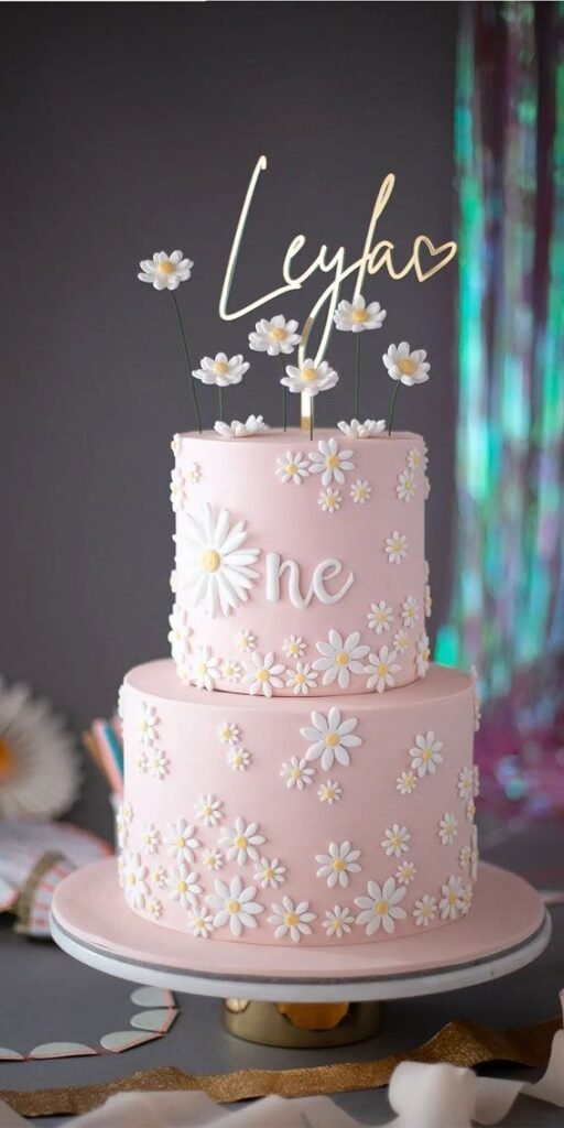 This enchanting two-tiered cake is a garden of joy. Covered in sweet pink frosting and adorned with countless white daisies, it’s truly charming. A large “one” proudly marks the special milestone.