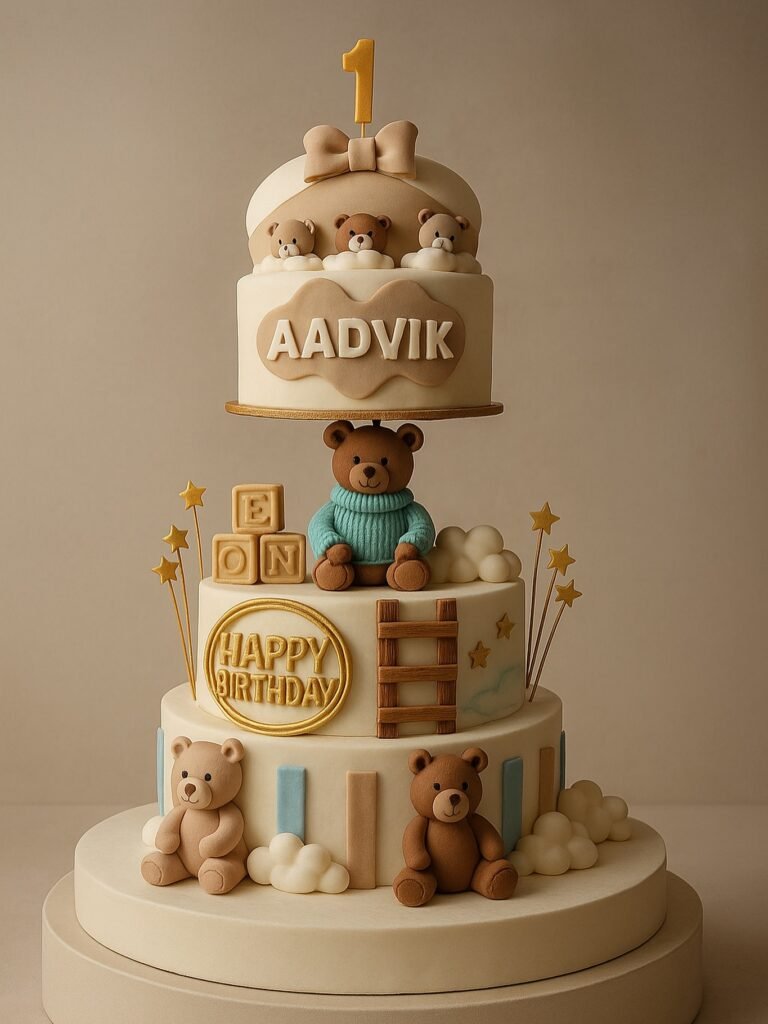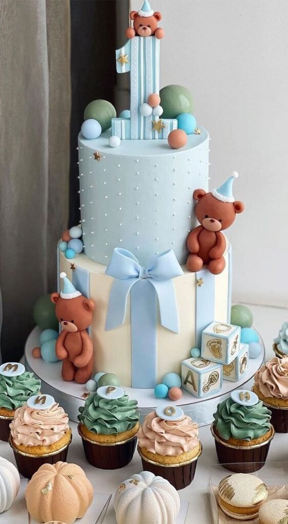 This grand, three-tiered cake is a celebration in itself. With two adorable teddy bears wearing party hats, it’s full of charm. The tiers are decorated with pearls and a big blue bow, adding a touch of elegance.