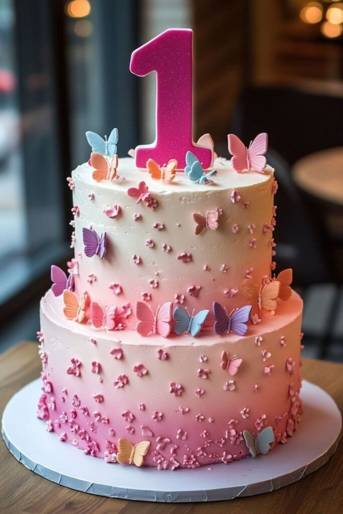 This lovely two-tiered cake features a cascade of delicate butterflies in a range of soft pastel colors. The pink ombre frosting creates a beautiful and dreamy effect, while a large, glittering number one marks the special occasion.