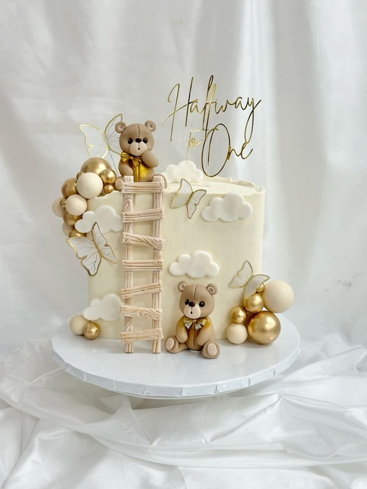 This charming cake is a sweet way to celebrate a six-month milestone. Two adorable teddy bears, one climbing a ladder, are the stars of this delightful scene. The white frosting is decorated with puffy clouds and golden butterflies.