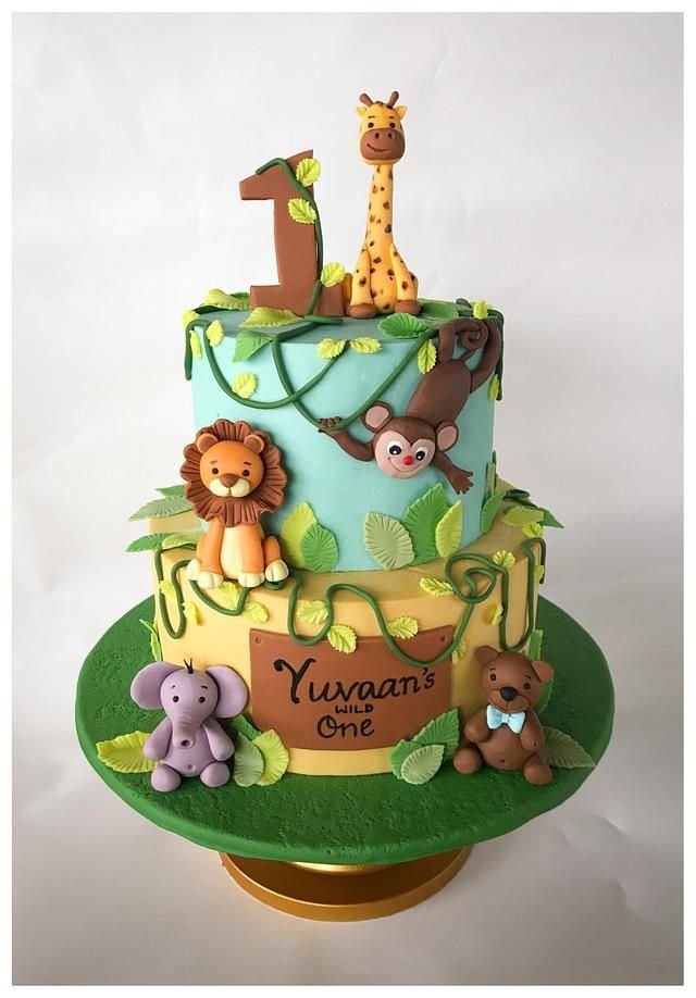 Vibrant two-tiered cake is a fun tribute to a “Wild One.” Playful jungle animals like a giraffe, lion, and monkey are ready to celebrate. The green vines and leaves create a lively, adventurous atmosphere.