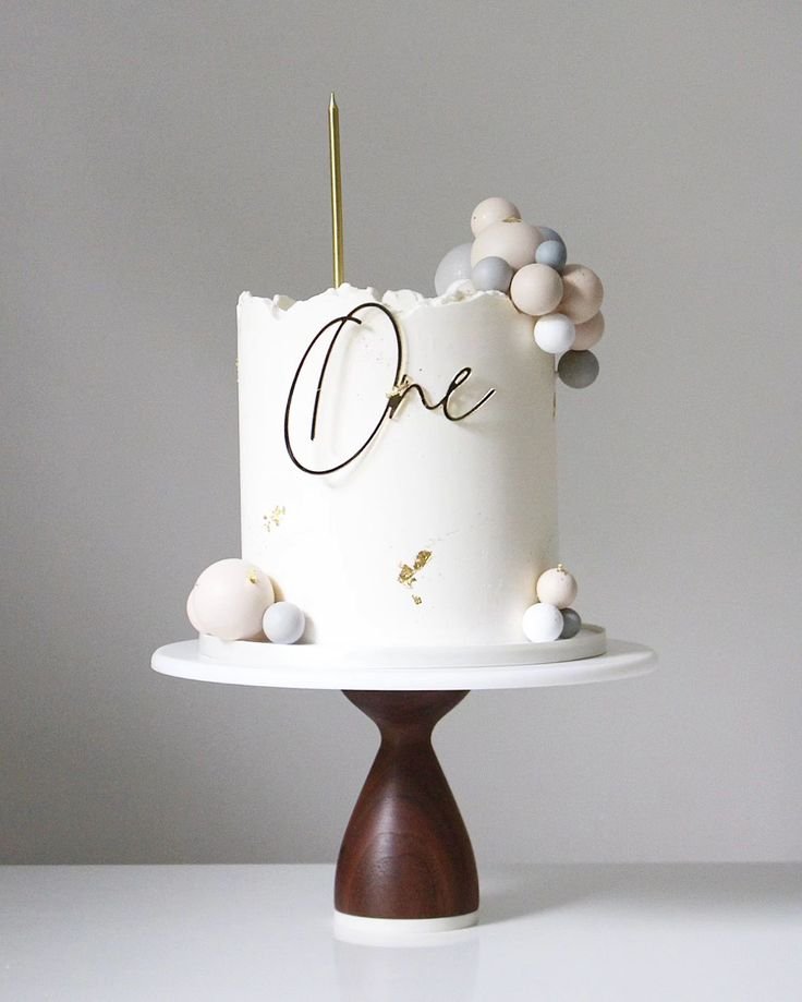 A beautiful golden “One” topper stands out against the simple backdrop. The clusters of spheres in soft, neutral colors add a playful and artistic dimension to the cake. It’s a gorgeous centerpiece for any party.