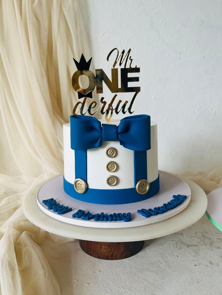 The topper is a fun play on words, reading “Mr. ONEderful,” which is a clever and festive detail. The base of the cake is personalized with a name, making this a truly unique piece. It’s a wonderful, memorable creation.