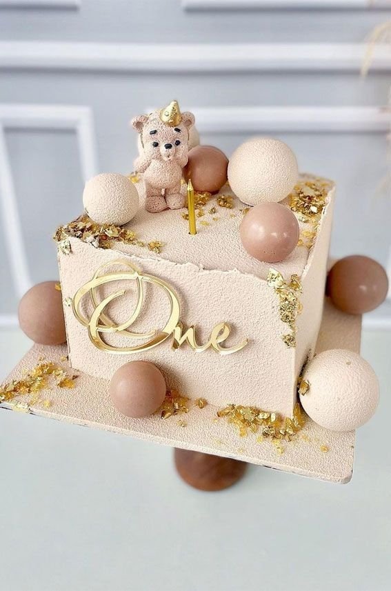 The frosting has a unique, sandy texture, and is beautifully adorned with shimmering gold flakes. A sleek, golden “One” topper adds a sophisticated touch. The different sized spheres add a playful, celebratory feel to the cake’s design.