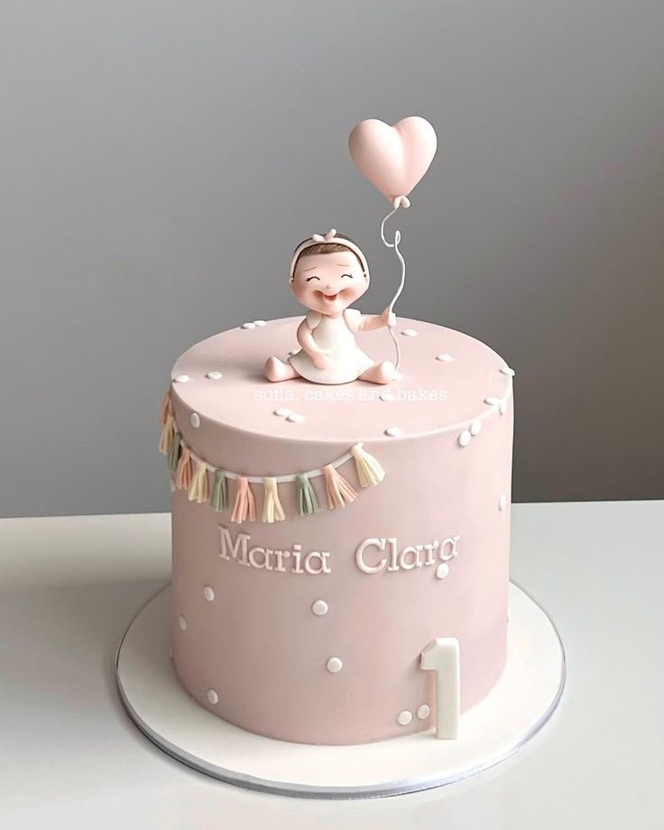 This adorable pink cake celebrates a special day with sweet details. A happy baby figurine sits on top, holding a heart-shaped balloon, radiating joy. The soft pink frosting is decorated with delicate white polka dots and a cute banner.