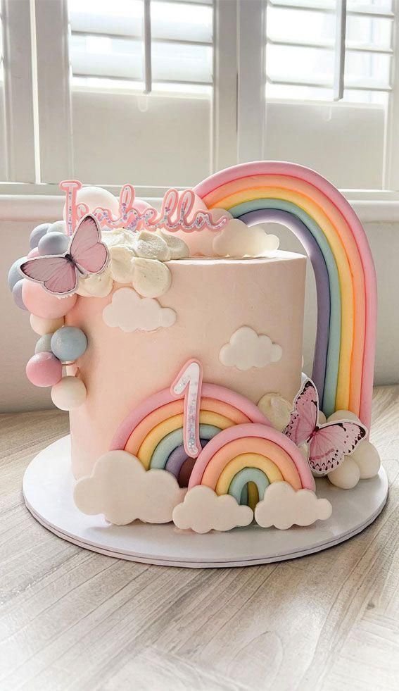 This beautiful cake is a sweet celebration of color and magic. A stunning rainbow arches over the top, while a smaller one with a number one sits at the base. The soft pink frosting is decorated with puffy clouds and butterflies.